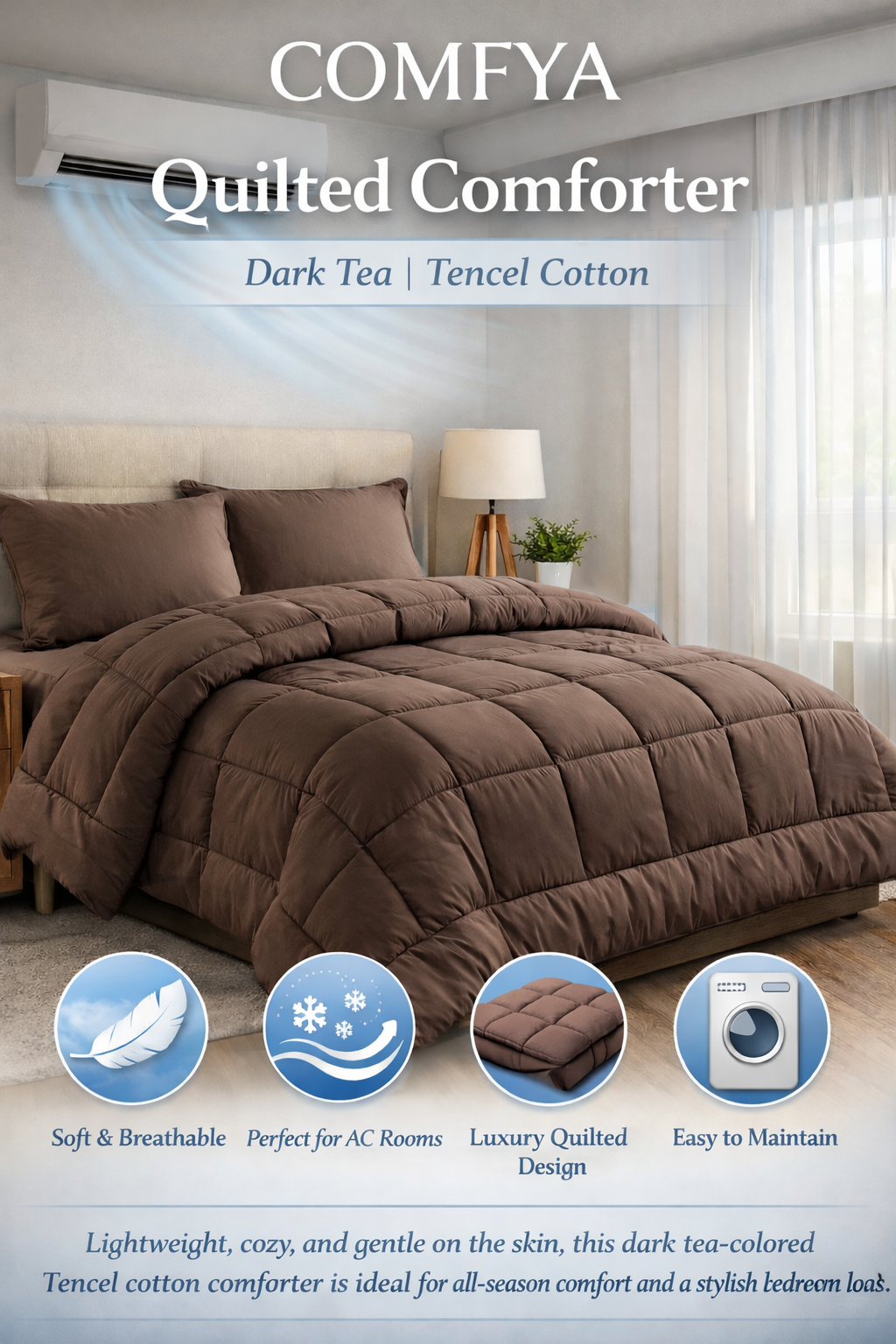 Experience soft, breathable luxury with this dark tea-colored quilted comforter from COMFYA, crafted from premium Tencel cotton fabric. Lightweight and cozy, it’s perfect for AC rooms and all-season comfort. The quilted design keeps the filling evenly distributed, while the easy-care fabric ensures long-lasting use and effortless maintenance. Ideal for a stylish, comfortable bedroom upgrade.